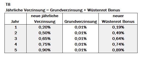 - neue Verzinsung: Die jährliche Verzinsung setzt sich bei diesem Tarif aus einer Grundverzinsung und einem gestaffelten Wüstenrot Bonus zusammen. Die neue durchschnittliche Verzinsung bei einer Laufzeit von 5 Jahren ergibt 0,60% p.a.
