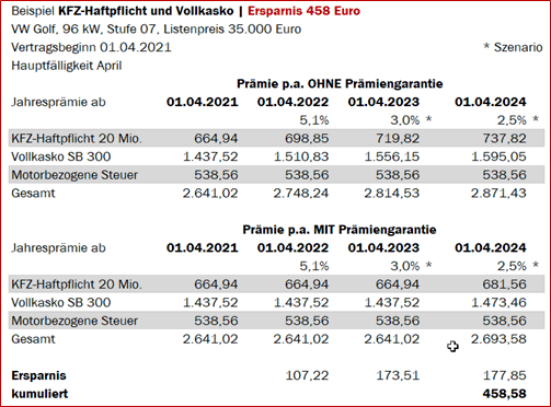 Eine Szenario-Rechnung für eine KFZ-Haftpflicht- und Vollkaskoversicherung für einen VW Golf (96 kW, Stufe 07, Listenpreis 35.000 Euro) zeigt eine Ersparnis von in Summe immerhin 458 Euro, die unsere 3jährige Prämiengarantie mit sich bringt.