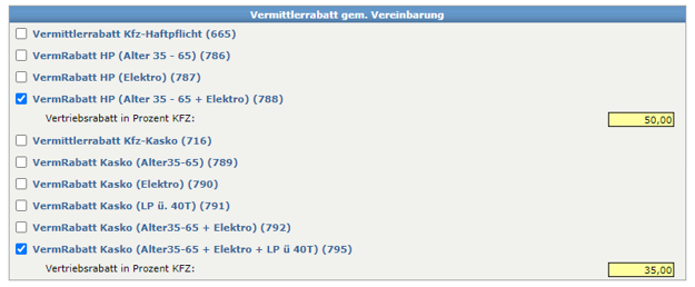 Es werden entsprechend der getroffenen Eingabe alle für den konkreten Geschäftsfall möglichen Rabatte für Haftpflicht bzw. Vollkasko zur Auswahl angeboten. In der jeweils letzten Zeile steht der maximal mögliche Rabatt zur Verfügung.