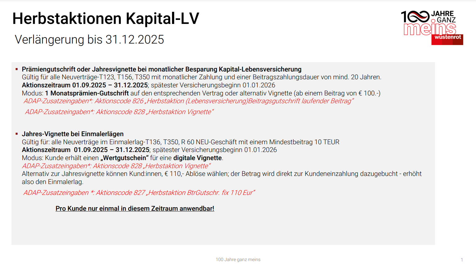 gerne informieren wir darüber, dass unsere Herbstaktionen in der Kapital-Lebensversicherung – „Beitragsgutschrift oder Vignette“ – bis zum 31.12.2025 verlängert wurden.