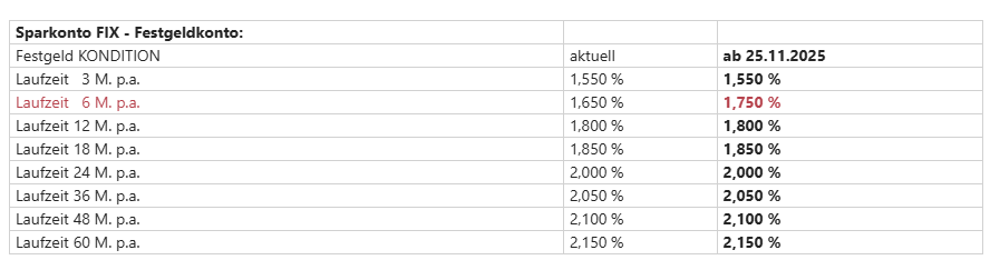 aufgrund der aktuellen Marktsituation kommt es beim Festgeldkonto FIX (6 Monate Laufzeit) per 25.11.2025 zu nachfolgenden Konditionsanpassungen: