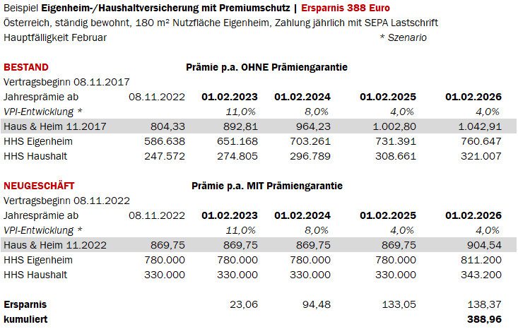 Die 3jährige Prämiengarantie, die in Zeiten wie diesen als „Inflationsbremse“ noch mehr an Bedeutung gewonnen hat, gilt nicht nur wie bisher für Neuverträge, sondern ab sofort auch bei Tarifwechsel. Auf Kundenwunsch kann diese Prämiengarantie gegen Beitragsnachlass ausgeschlossen werden.