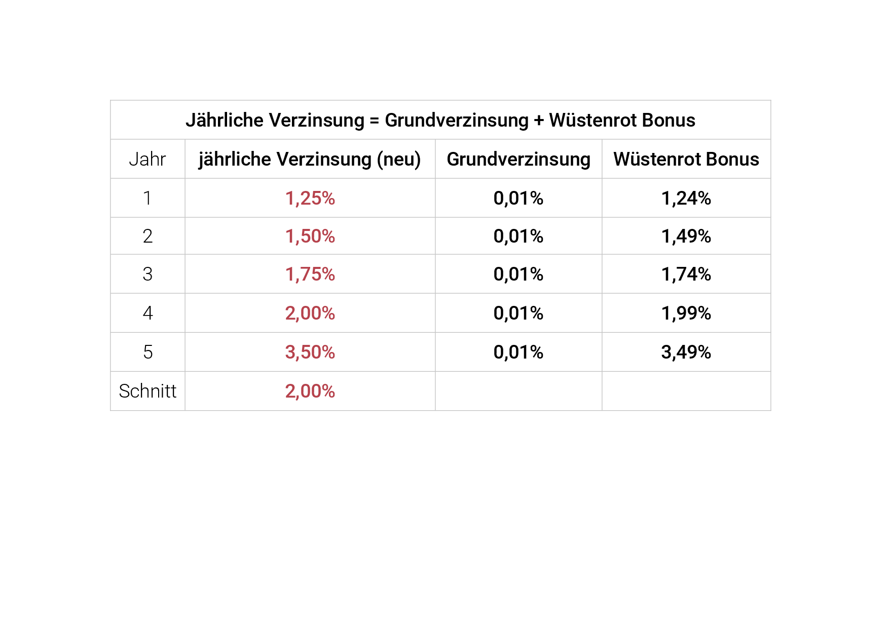 Die neue durchschnittliche Verzinsung bei einer Laufzeit von 5 Jahren beträgt 2,00 % (= jährlich steigender Zinssatz von 1,25 % p.a. im ersten Jahr bis 3,50 % p.a. im fünften Jahr).