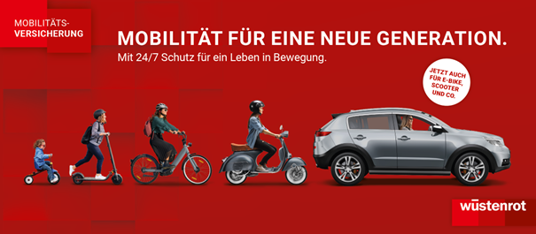 Mobilität für eine neue Generation. Mit 24/7 Schutz für ein Leben in Bewegung. Jetzt auch für E-Bike, Scooter und Co. Mit der neuen Mobilitätsversicherung bieten wir Kund:innen optimalen Schutz für ein Leben in Bewegung. Und das mit nur einer Versicherung!