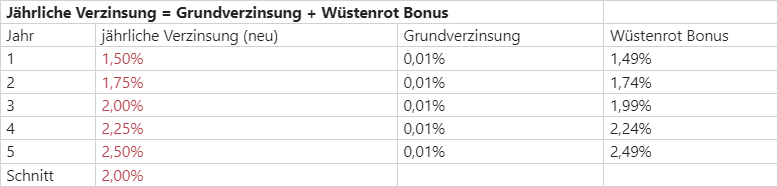 Die neue durchschnittliche Verzinsung bei einer Laufzeit von 5 Jahren beträgt 2,00 % p.a. (jährlich steigender Zinssatz von 1,50 % p.a. im ersten Jahr bis 2,50 % p.a. im fünften Jahr). Nach Ablauf von fünf Jahren sinkt die Verzinsung des gesamten Bausparguthabens unverändert auf 0,01 % p.a.