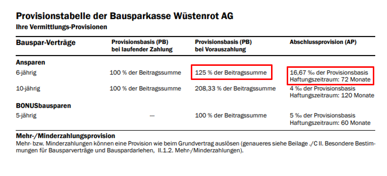 - Bei laufender Einzahlung ergibt sich dadurch eine Abschlussprovision (AP) von € 120,00 pro voll besparten Bausparvertrag