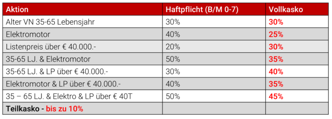 Dabei werden die Mobilitäts-Rabatte für die Voll-Kasko um 10% angehoben; in der Teil-Kasko wird ein 10%-tiger Rabatt eingeführt.