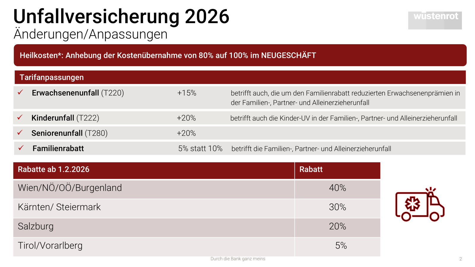 mit 1.2.2026 kommt es neben einer wesentlichen Produktverbesserung im UV-Baustein „Heilkosten“ zu Tarifanpassungen in unseren Unfallversicherungstarifen sowie einer Aktualisierung des Rabattsystems.
