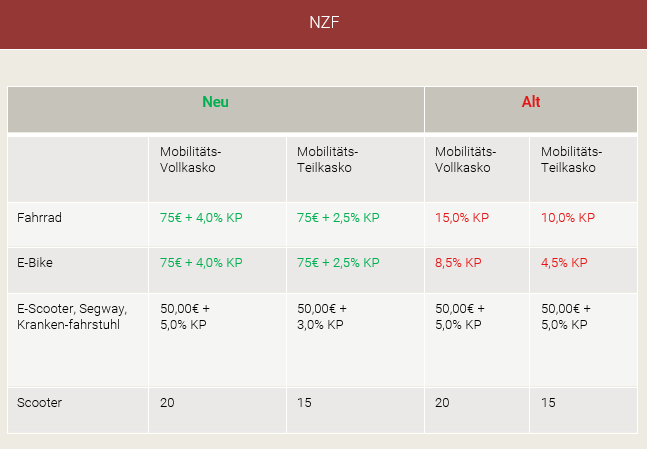 Die Kaskoprämien ändern sich bei den NZF wie folgt: