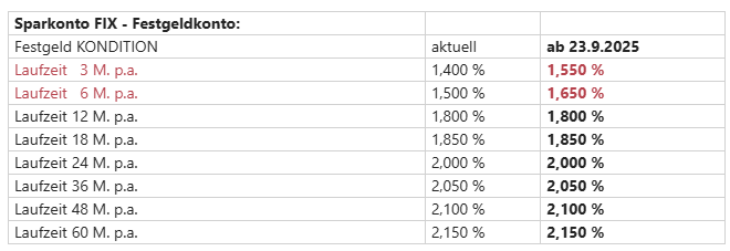 aufgrund der aktuellen Marktsituation kommt es beim Festgeldkonto FIX (3 Monate und 6 Monate Laufzeit) per 23.09.2025 zu nachfolgenden Konditionsanpassungen: